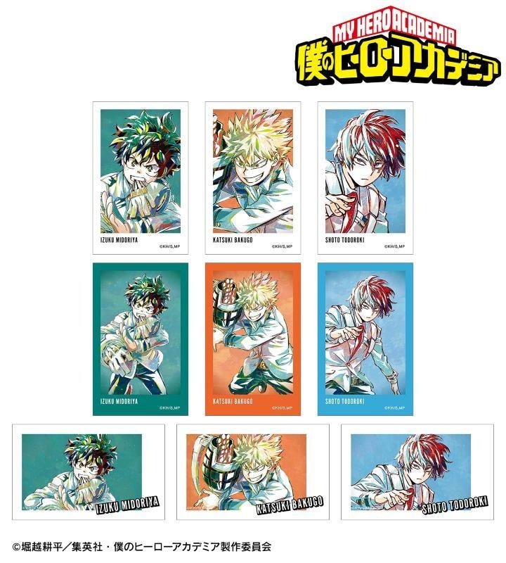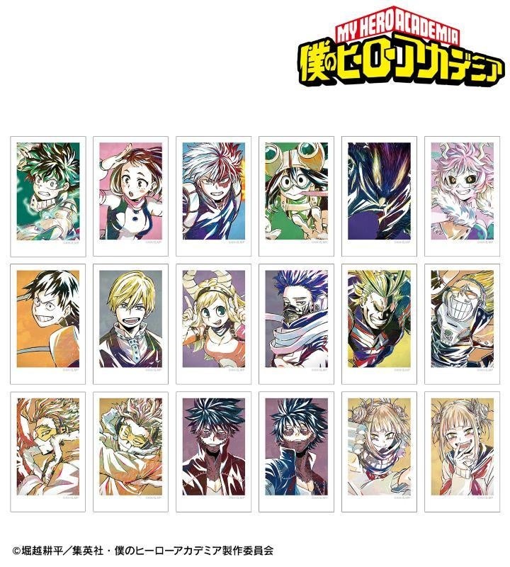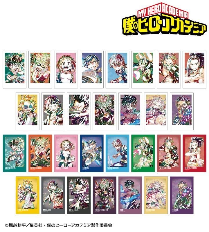緑谷出久、麗日お茶子、轟焦凍、蛙吹梅雨、常闇踏陰、芦戸三奈、瀬呂範太、物間寧人、角取ポニー、心操人使、オールマイト、プレゼント・マイク、ホークス、荼毘、トガヒミコのビジュアルを新たなタッチで魅力的に表現し、インスタントフィルム風のイラストカードに仕上げました。