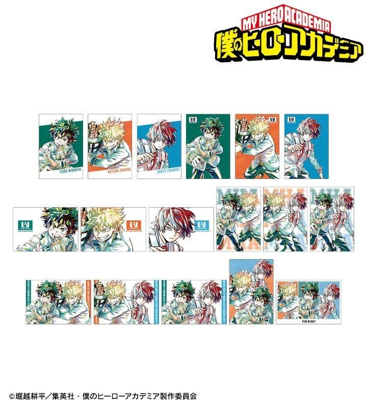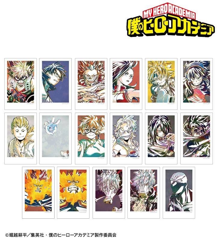 緑谷出久、爆豪勝己、麗日お茶子、飯田天哉、轟焦凍、蛙吹梅雨、切島鋭児郎、八百万百、上鳴電気、耳郎響香、相澤消太、死柄木弔、荼毘、トガヒミコ、オーバーホールのビジュアルを新たなタッチで魅力的に表現し、インスタントフィルム風のイラストカードに仕上げました。