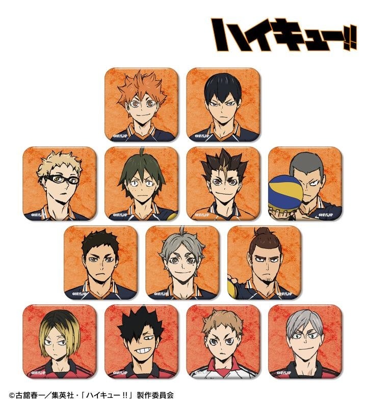 日向翔陽、影山飛雄、月島 蛍、山口 忠、西谷 夕、田中龍之介、澤村大地、菅原孝支、東峰 旭、孤爪研磨、黒尾鉄朗、夜久衛輔、灰羽リエーフのビジュアルをスクエア缶バッジに仕上げました。