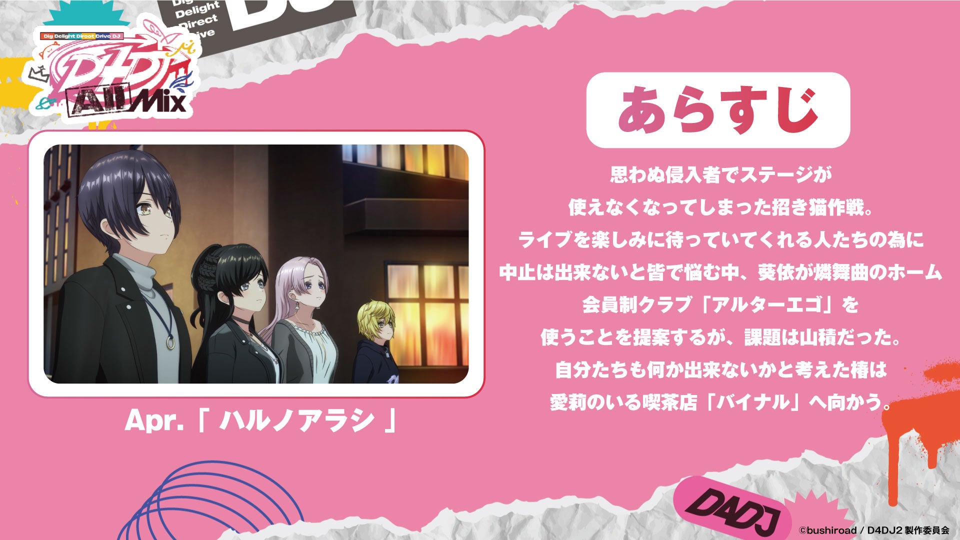 株式会社ブシロード(本社:東京都中野区、代表取締役社長:木谷高明)は、2月3日(金)23時よりTOKYO MX、BS日テレほかにて放送のTVアニメ「D4DJ All Mix」第4話あらすじと先行場面カットの公開をしたことをご案内いたします。