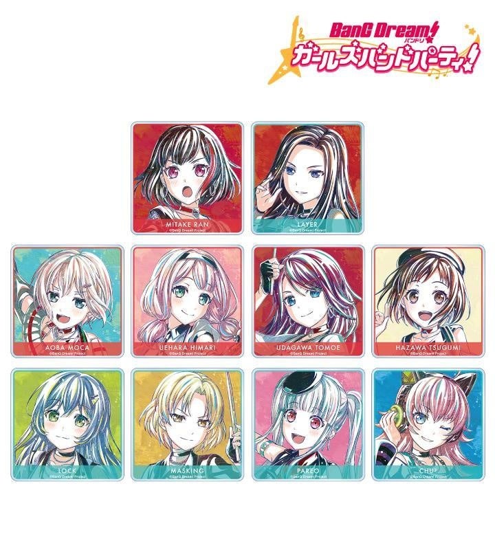 美竹 蘭、青葉 モカ、上原 ひまり、宇田川 巴、羽沢 つぐみ、レイヤ、ロック、マスキング、パレオ、チュチュのイラストを新たなタッチで魅力的に表現し、アクリルコースターに仕上げました。