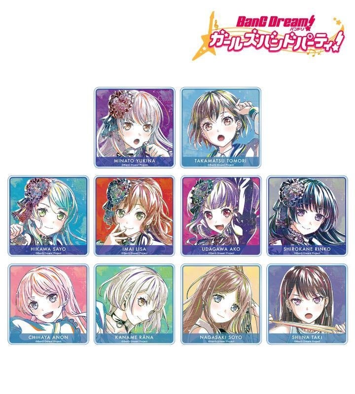 湊 友希那、氷川 紗夜、今井 リサ、宇田川 あこ、白金 燐子、高松 燈、千早 愛音、要 楽奈、長崎 そよ、椎名 立希のイラストを新たなタッチで魅力的に表現し、アクリルコースターに仕上げました。