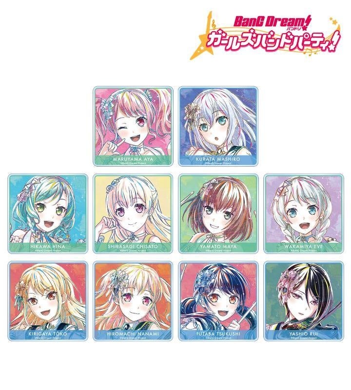 戸山 香澄、花園 たえ、牛込 りみ、山吹 沙綾、市ヶ谷 有咲、弦巻 こころ、瀬田 薫、北沢 はぐみ、松原 花音、ミッシェルのイラストを新たなタッチで魅力的に表現し、アクリルコースターに仕上げました。