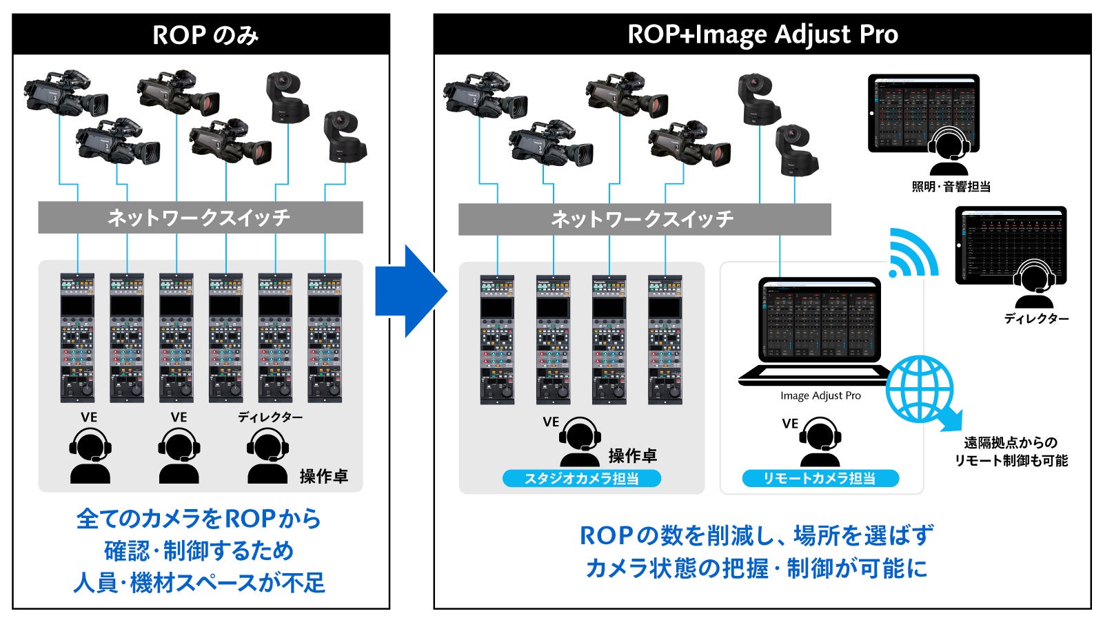 番組制作や大規模イベントの現場では、複数種類のカメラを大量に用いたマルチカメラ撮影が行われます。このような現場においては、画質調整のためのリモートオペレーションパネル(以下、ROP)が、設置スペースの不足によりカメラの台数分設置できない、カメラの種類ごとに画質調整の方法が異なるなどの事象が発生しやすく、スムーズな映像制作を行う上で課題となっていました。