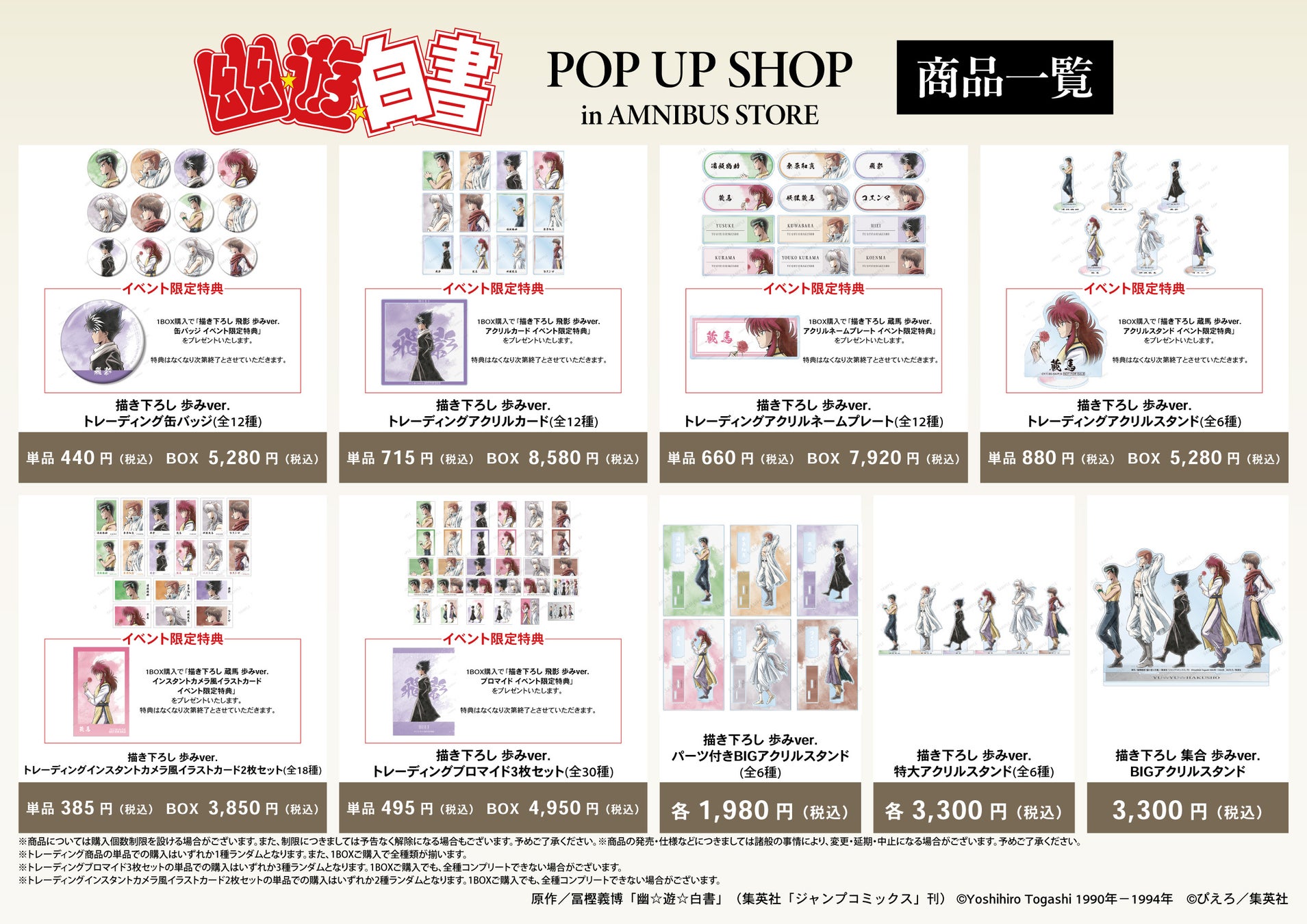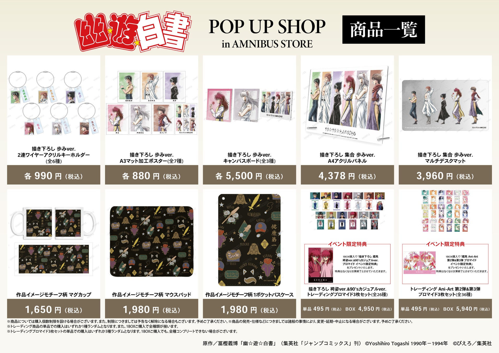 今回のイベントでは、『幽☆遊☆白書』より「歩み」をコンセプトにした新規描き下ろしイラストを使用したグッズを多数先行販売する他、AMNIBUS STORE購入特典の配布を予定しております。
