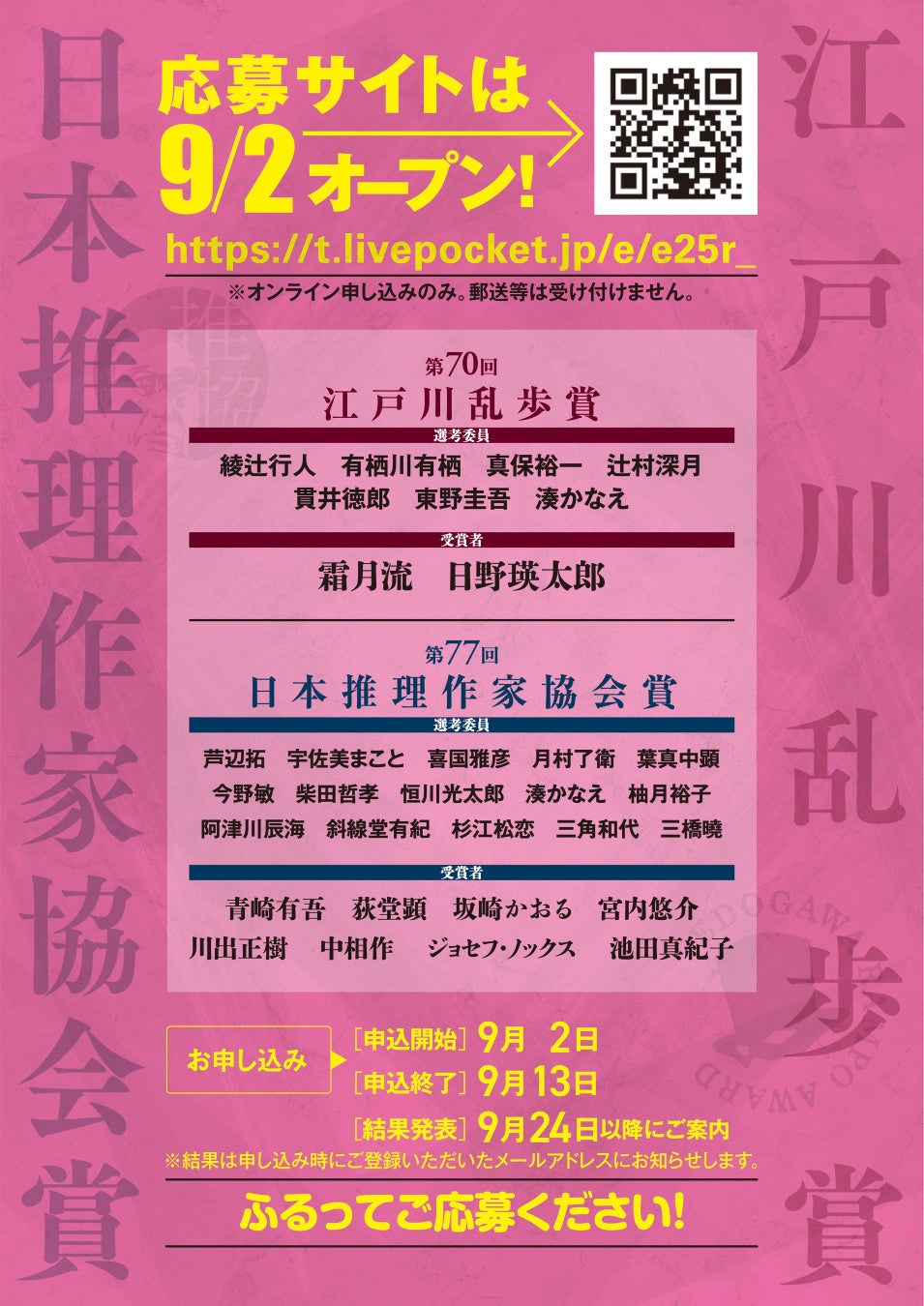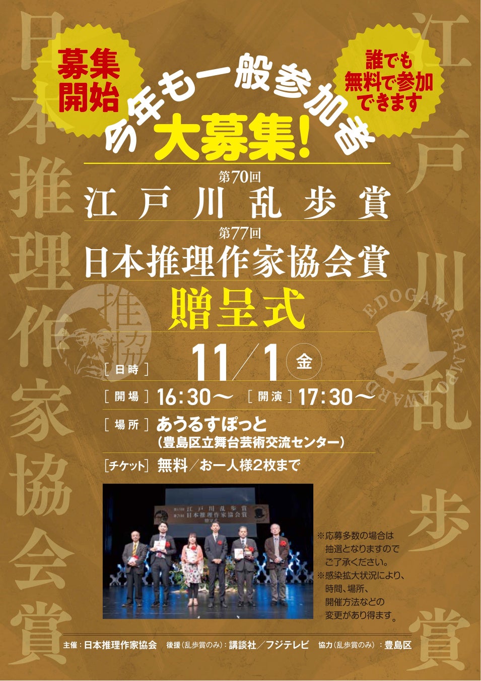 今年もやります!ミステリ作家大集合!!第70回江戸川乱歩賞/第77回日本推理作家協会賞贈呈式 一般参加者募集開始