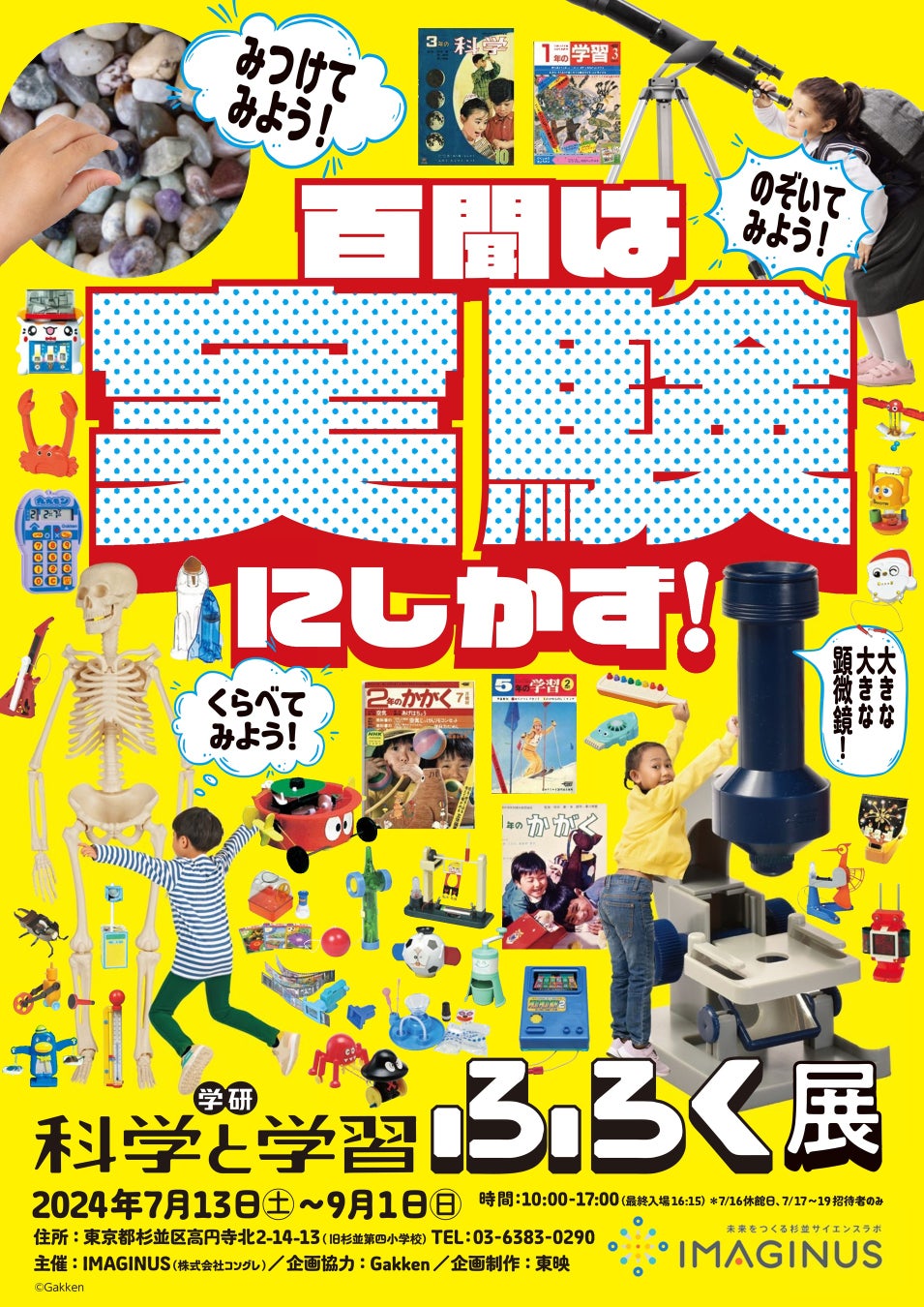 株式会社 学研ホールディングス(東京・品川/代表取締役社長:宮原 博昭)のグループ会社、株式会社 Gakken(東京・品川/代表取締役社長:五郎丸 徹)は株式会社コングレ(東京本社:中央区日本橋/代表取締役社長:武内 紀子)が運営する、杉並第四小学校の跡地を活用した「未来をつくる杉並サイエンスラボ IMAGINUS(イマジナス)」にて、東映株式会社(中央区銀座/代表取締役社長:吉村 文雄)企画制作による 《百聞は実験にしかず! 学研『科学と学習』ふろく展》を2024年7月13日(土)より開催し、会場にて限定公式ブック『科学と学習 ふろく大百科』を販売いたします。