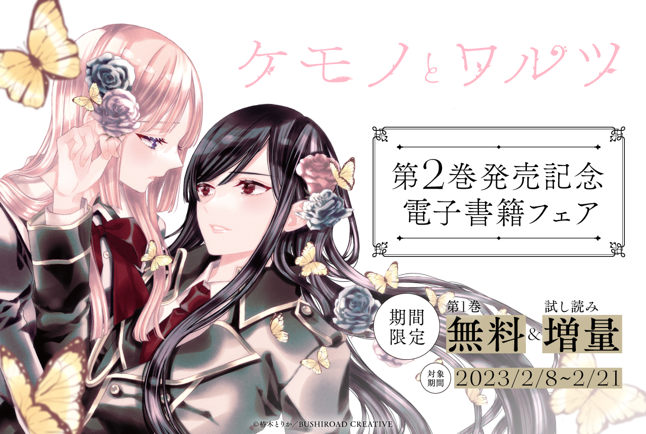 株式会社ブシロード(本社:東京都中野区、代表取締役社⻑:木谷高明、以下ブシロード)のグループ会社にあたる株式会社ブシロードクリエイティブ(本社:東京都中野区、代表取締役社長:成田耕祐)は、本日2月8日(水)に「ケモノとワルツ」2巻が発売すること、またそちらを記念した電子書籍フェアが開始することをご案内致します。