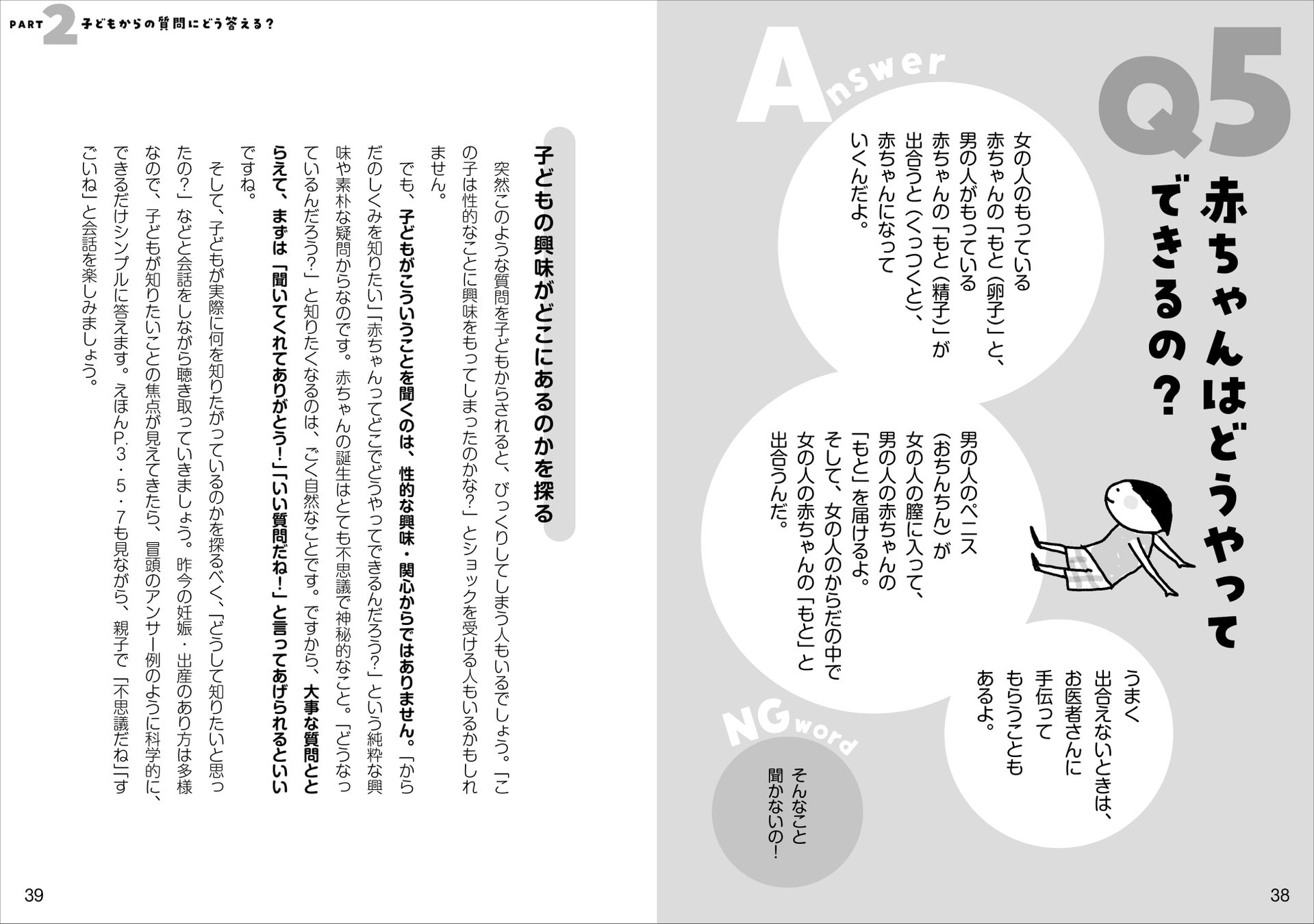 「なんで、〇〇ちゃんにはおちんちんがないの?」「赤ちゃんはどうやってできるの?」「おちんちんがピン! ってなるのはなんで?」「なんで、ママから血が出るの?」…など、幼児〜小学校低学年の子どもから聞かれたときに、親が思わず戸惑ってしまうような質問を取り上げ、そのまま伝えられるアンサー例と解説です。