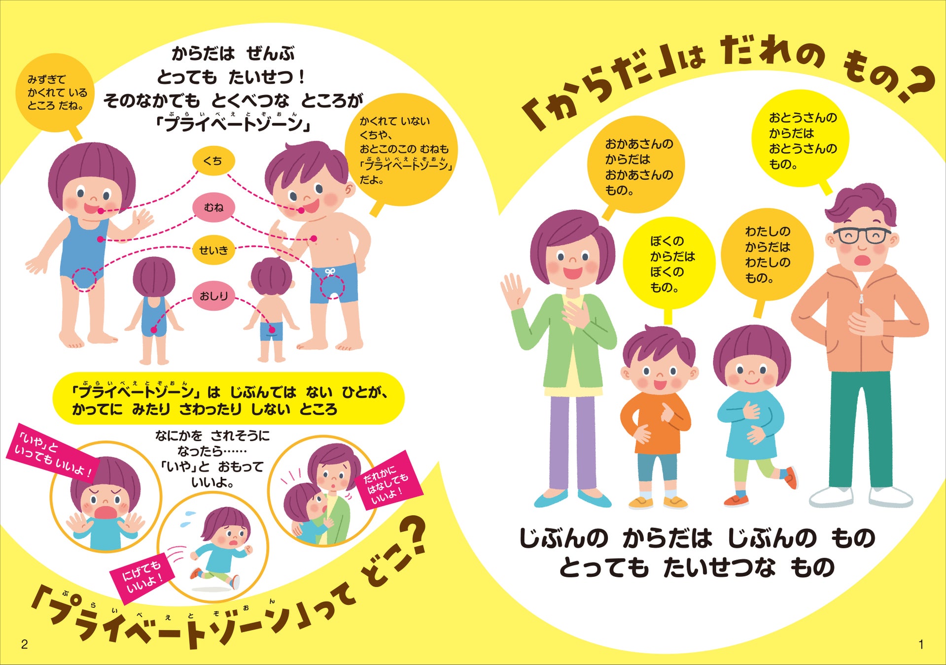 巻末に「じぶんの からだを たいせつに する えほん」がついています。軽く引っ張ると取り外せ、からだのしくみについて、子どもと一緒に読み進められるミニ絵本です。「『からだ』は だれの もの? 」「『プライベートゾーン』って どこ? 」「おとこのこ・おとこの ひとの からだ」「おんなのこ・おんなの ひとの からだ 」「あかちゃんの たんじょう」を、医療監修のもと、わかりやすく正確で、しかもかわいらしいイラストで解説!
