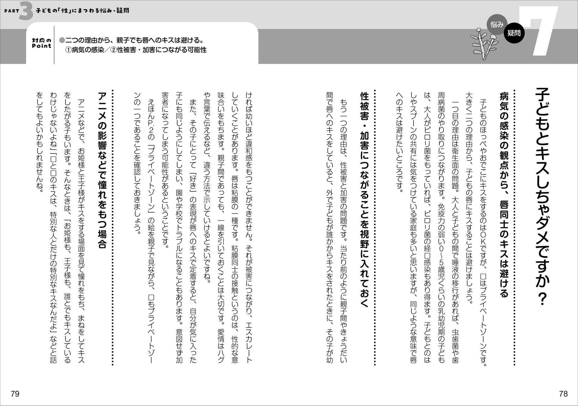 子どもの性に関連する悩みは周囲に相談しづらいもの。「性器いじりにはどう対応したらいい?」「子どもが友達のパンツを下げるあそびをしているようです……」「親が子どものおしりをふくのは、いつまで?」「子どもとキスしちゃダメですか?」…など、幼児・小学校低学年の子どもをもつ親からよく挙がってくる悩みや疑問に対して、アドバイスします。