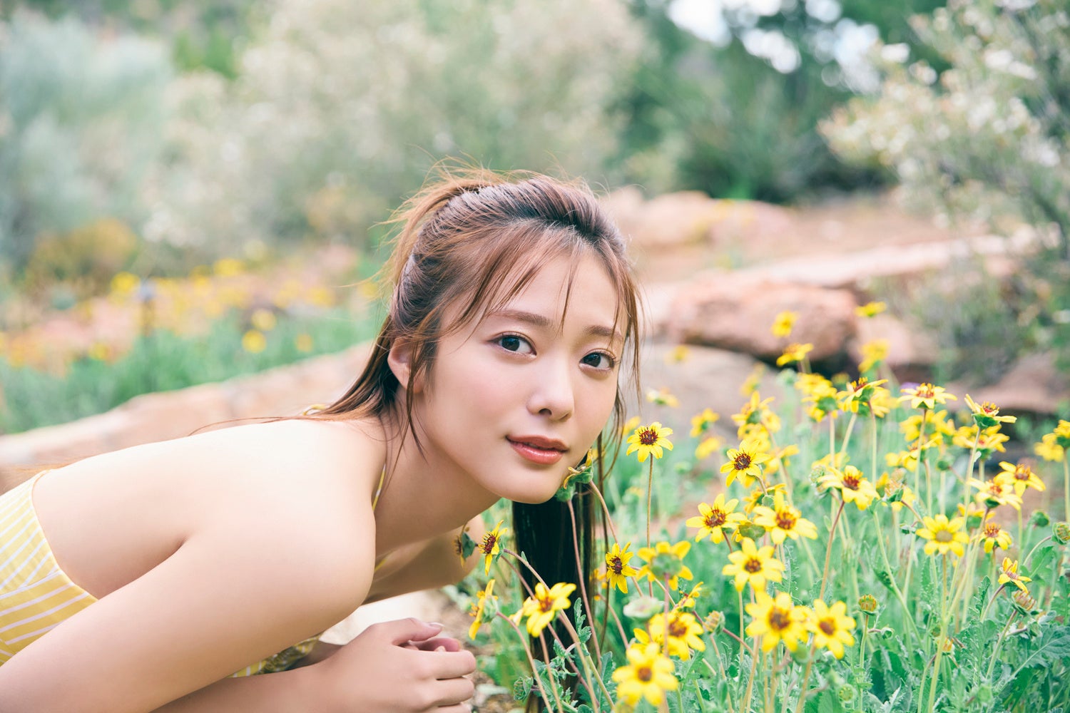 サンタフェ郊外で撮影されたこのカットは、黄色いワンピースと黄色い花のコンビネーションで本人の清楚さ、爽やかさを演出、いつも身近にいるような気持ちにさせる、まさに「ほのちゃんの隣の席になりたい」世界観を表しています。