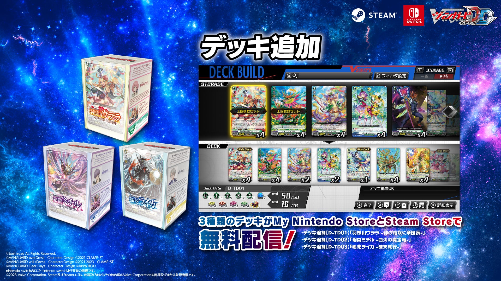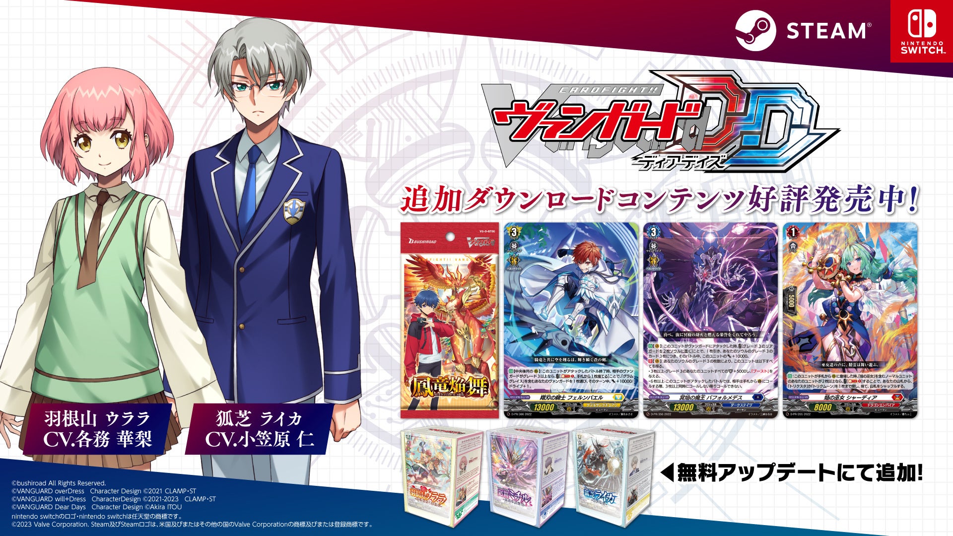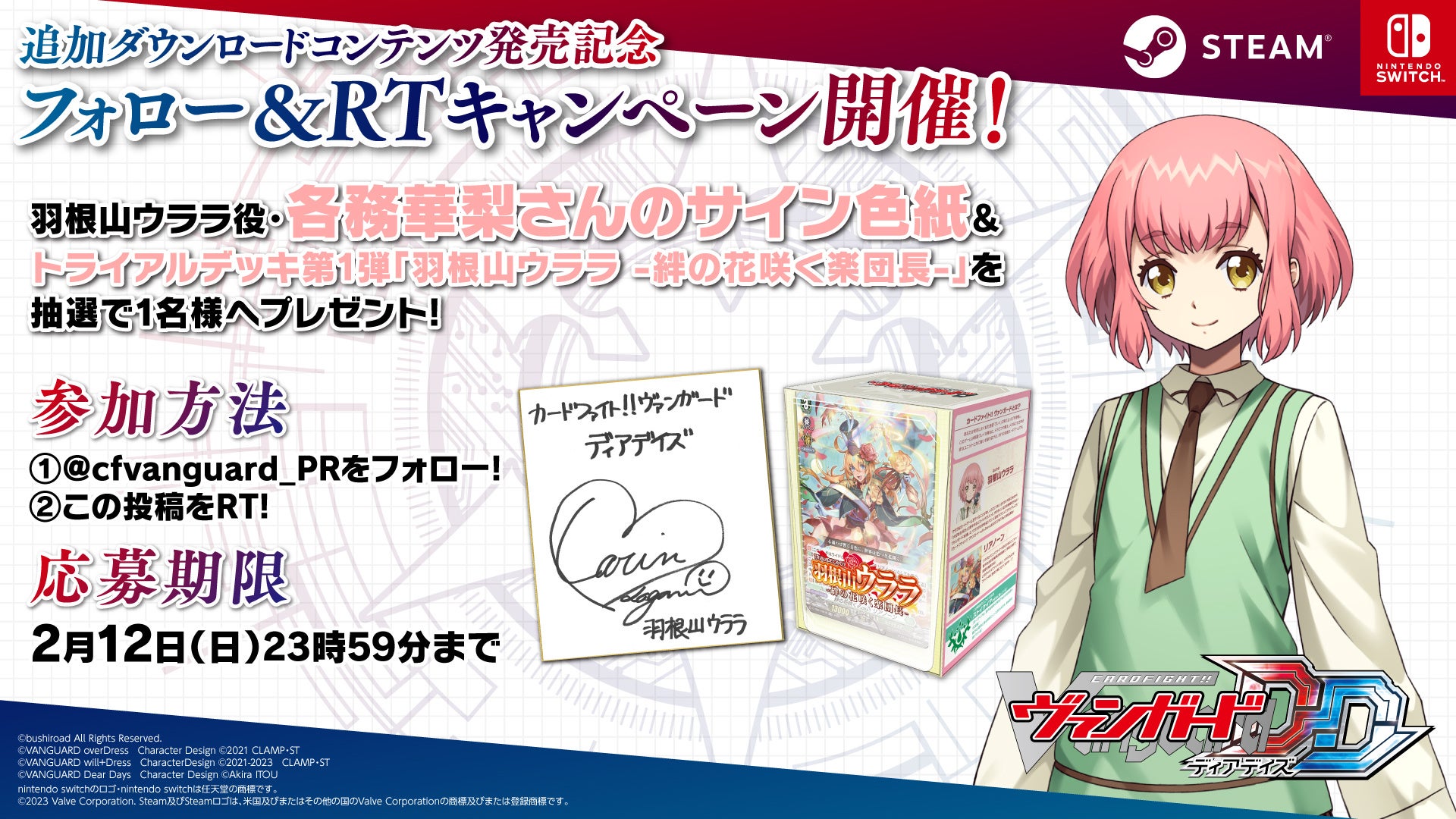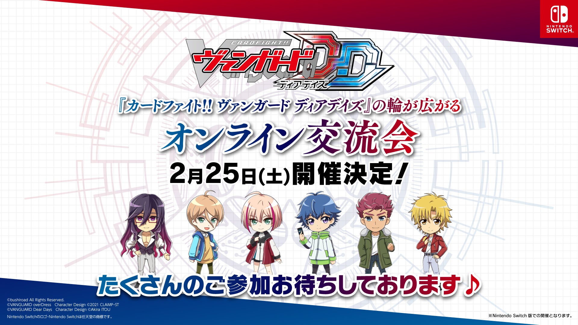 株式会社ブシロード(本社:東京都中野区、代表取締役社長:木谷高明、以下ブシロード)は、Nintendo Switch™ / Steam🄬向け、対戦カードゲーム『カードファイト!! ヴァンガード ディアデイズ』より追加ダウンロードコンテンツ第1弾が発売された事をお知らせいたします。また、追加ダウンロードコンテンツ第1弾の発売を記念したフォロー&リツイートキャンペーンが開催され、オンライン交流会が2月25日(土)に開催決定いたしました。