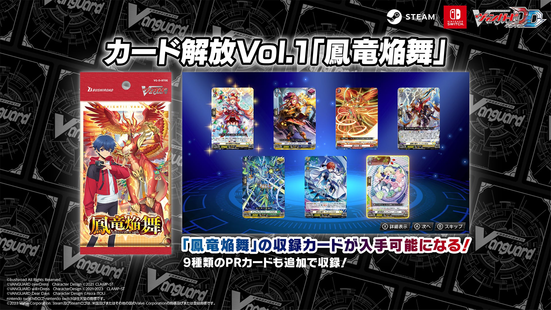 追加ダウンロード第1弾では、カード解放Vol.1【D-BT06】「鳳竜焔舞」や新ファイター「羽根山ウララ(CV.各務華梨)」「狐芝ライカ(CV.小笠原仁)」のキャラクターセット、トライアルデッキ追加等の豊富なラインナップが登場!