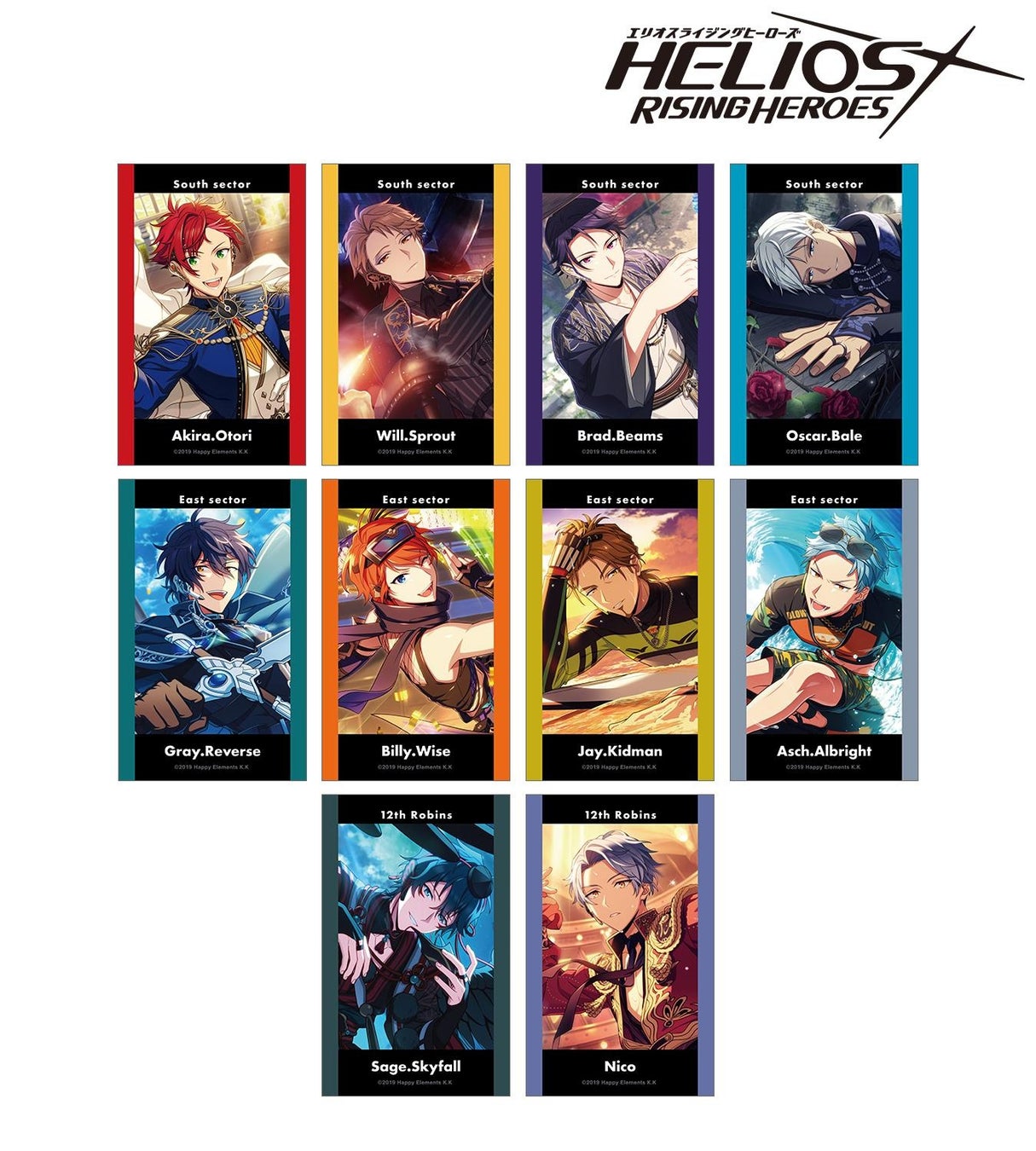 鳳アキラ、ウィル・スプラウト、ブラッド・ビームス、オスカー・ベイル、グレイ・リヴァース、ビリー・ワイズ、ジェイ・キッドマン、アッシュ・オルブライト、セイジ・スカイフォール、ニコのイラスト、キャラクター名、所属セクター名をインスタントフィルム風のデザインに仕上げました。