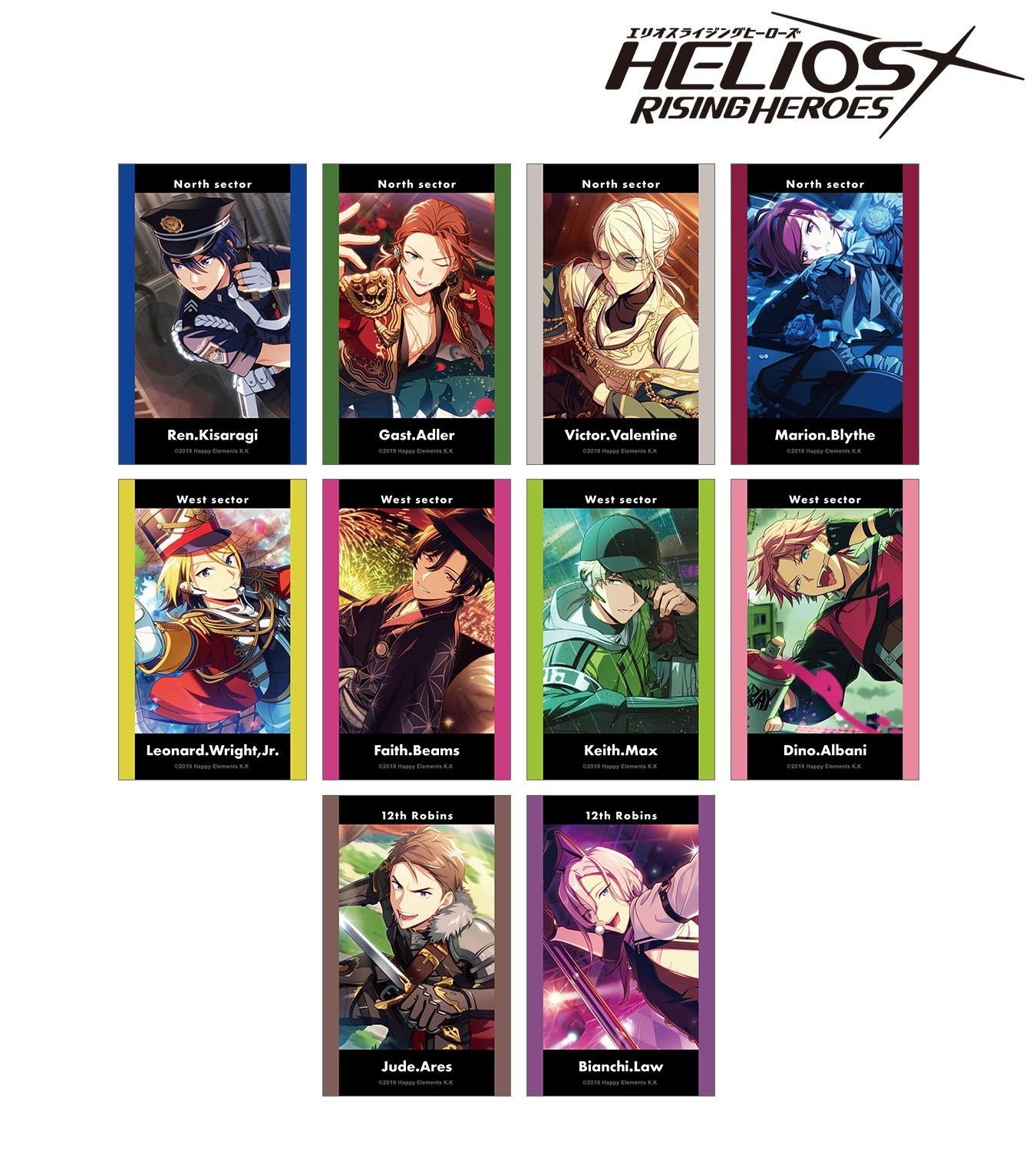 如月レン、ガスト・アドラー、ヴィクター・ヴァレンタイン、マリオン・ブライス、レオナルド・ライト・Jr、フェイス・ビームス、キース・マックス、ディノ・アルバーニ、ジュード・アレス、ビアンキ・ロウのイラスト、キャラクター名、所属セクター名をインスタントフィルム風のデザインに仕上げました。