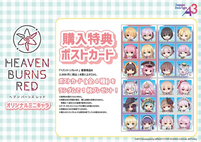 期間中に会場内にて『ヘブンバーンズレッド』新商品のみ、または新商品と関連商品を2,000円(税込)お買い上げごとに、特典ポストカード(全4種)をランダムで1枚プレゼント!
