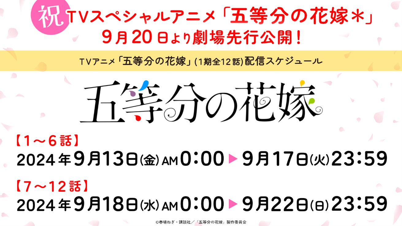 新作のTVスペシャルアニメ『五等分の花嫁*』が、2024年9月20日(金)より全国劇場にて3週間限定の上映が決定!これを記念して、講談社が運営するYouTubeチャンネル「フル☆アニメTV」にて、TVアニメ『五等分の花嫁』1期全12話を期間限定で無料配信いたします。【第1話~第6話】を本日9月13日から9月17日まで、【第7話~第12話】を9月18日から9月22日までの期間限定配信となりますので、『五等分の花嫁*』と一緒にお楽しみください!