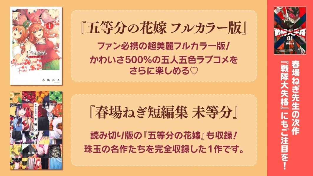 原作コミックス『五等分の花嫁』全14巻、そして春場ねぎ先生の最新作『戦隊大失格』第15巻は7月17日より大好評発売中。こちらもご注目ください!