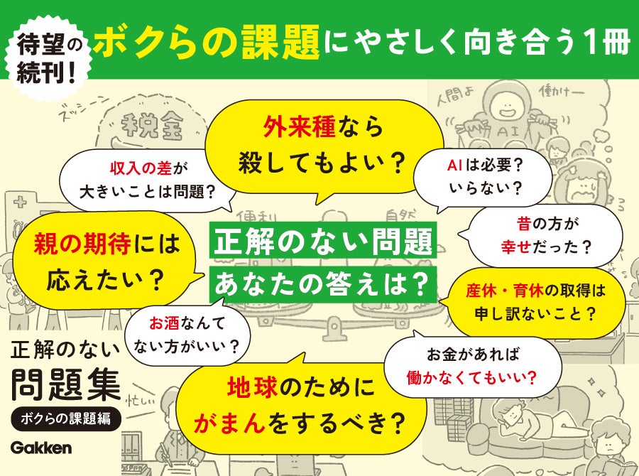 続刊となる本書『ボクらの課題編』は身近な課題をテーマに、「AIは必要?」「外来種なら殺してもよい?」「産休・育休は申し訳ないと思うべき?」「昔の方が幸せだった?」などなど、大人も頭を悩ませてしまうような、人によって正解が異なる30の問題について掲載しています。本作単独で楽しめますので、前作をご覧になっていない方も問題なくお読みいただけます。