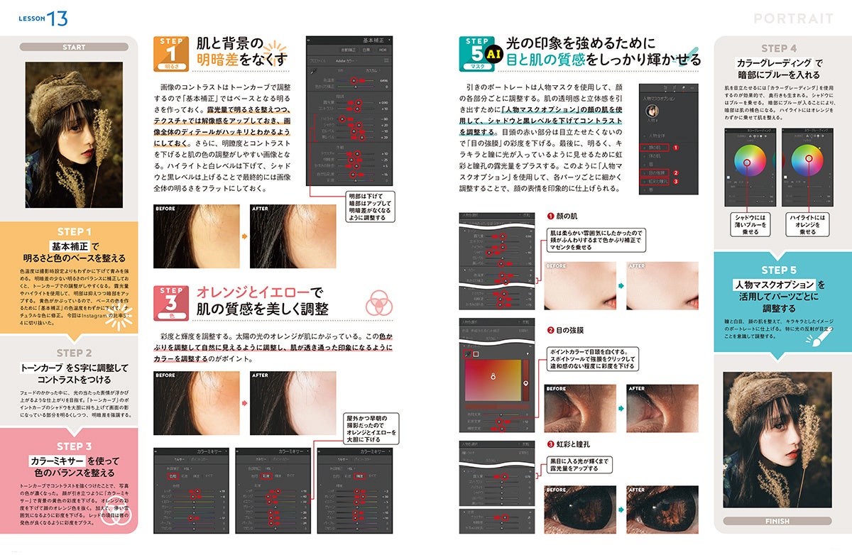 本書は大きく分けて2つのパートで構成されます。前半部は調整項目が変化量に応じてどのような効果を与えるのかを示します。HOW TOでは操作手順をしっかりと解説、HINTでは初心者が悩むであろうポイントをサポートします。後半部は風景やポートレート、都市風景、花火などのジャンルで活躍する人気写真家20人による実践テクニックを紹介。ステップ by ステップで手順を解説するため、読者が自分の写真ですぐに真似できます。