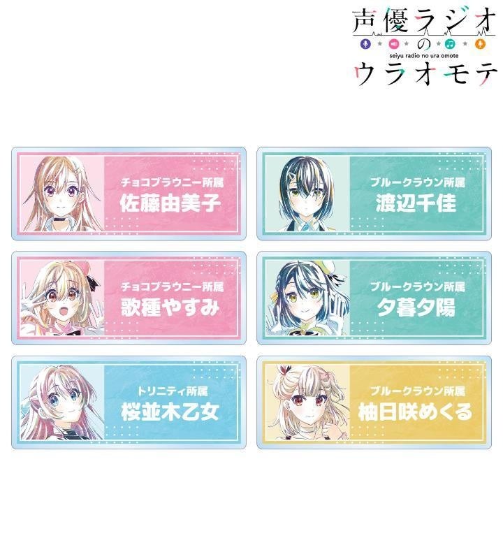 佐藤由美子、渡辺千佳、歌種やすみ、夕暮夕陽、桜並木乙女、柚日咲めくるのイラストを新たなタッチで魅力的に表現し、キャラクターカラーに合わせたアクリルネームプレートに仕上げました。
