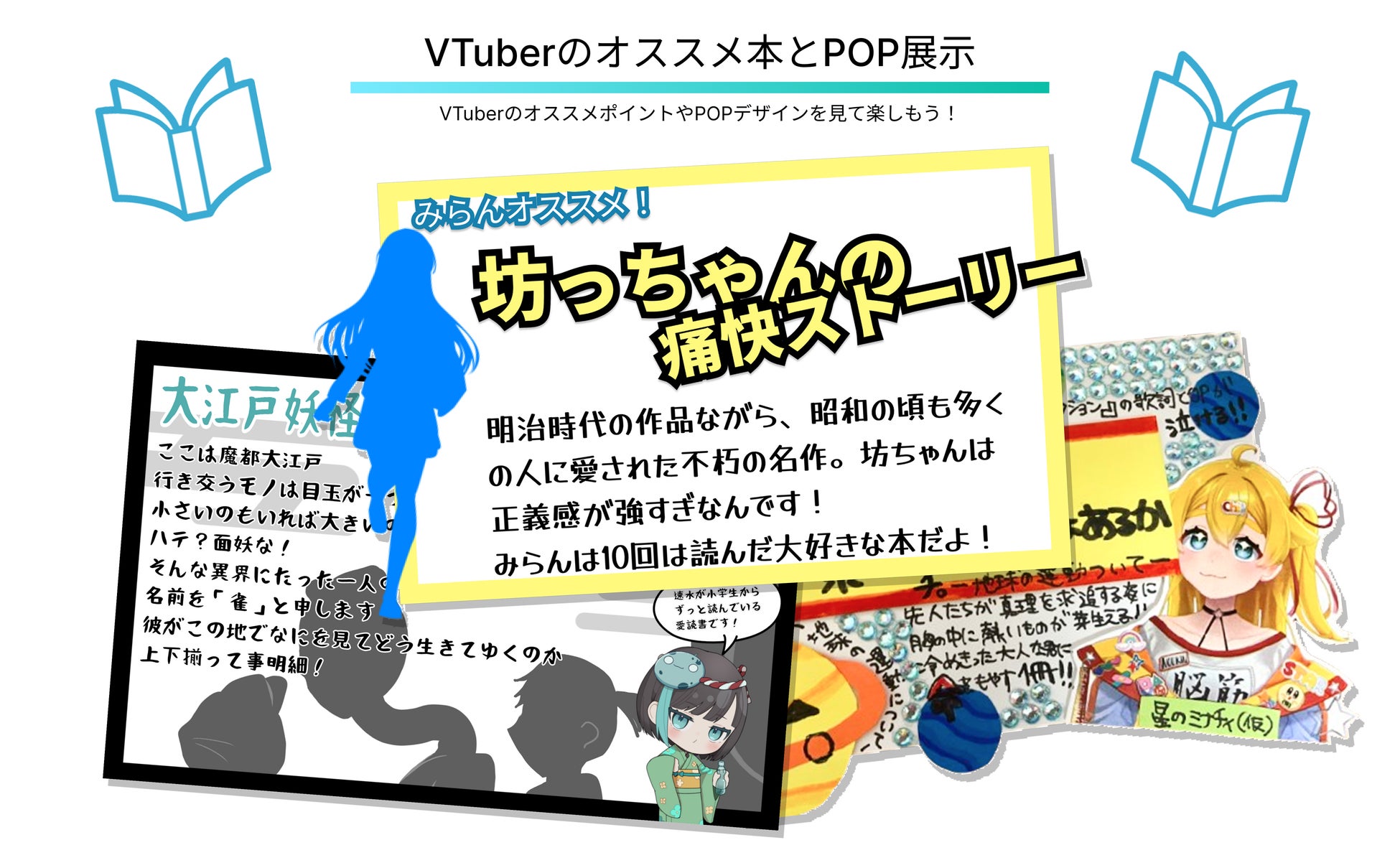 VTuber70名以上がお勧めする100点以上のイチオシ本を、VTuberそれぞれが作ったPOPと共に展示されます。また、オススメ本は一部購入可能なだけでなく、オススメしたVTuberのオリジナルポストカードなど購入特典が付く本もあります。