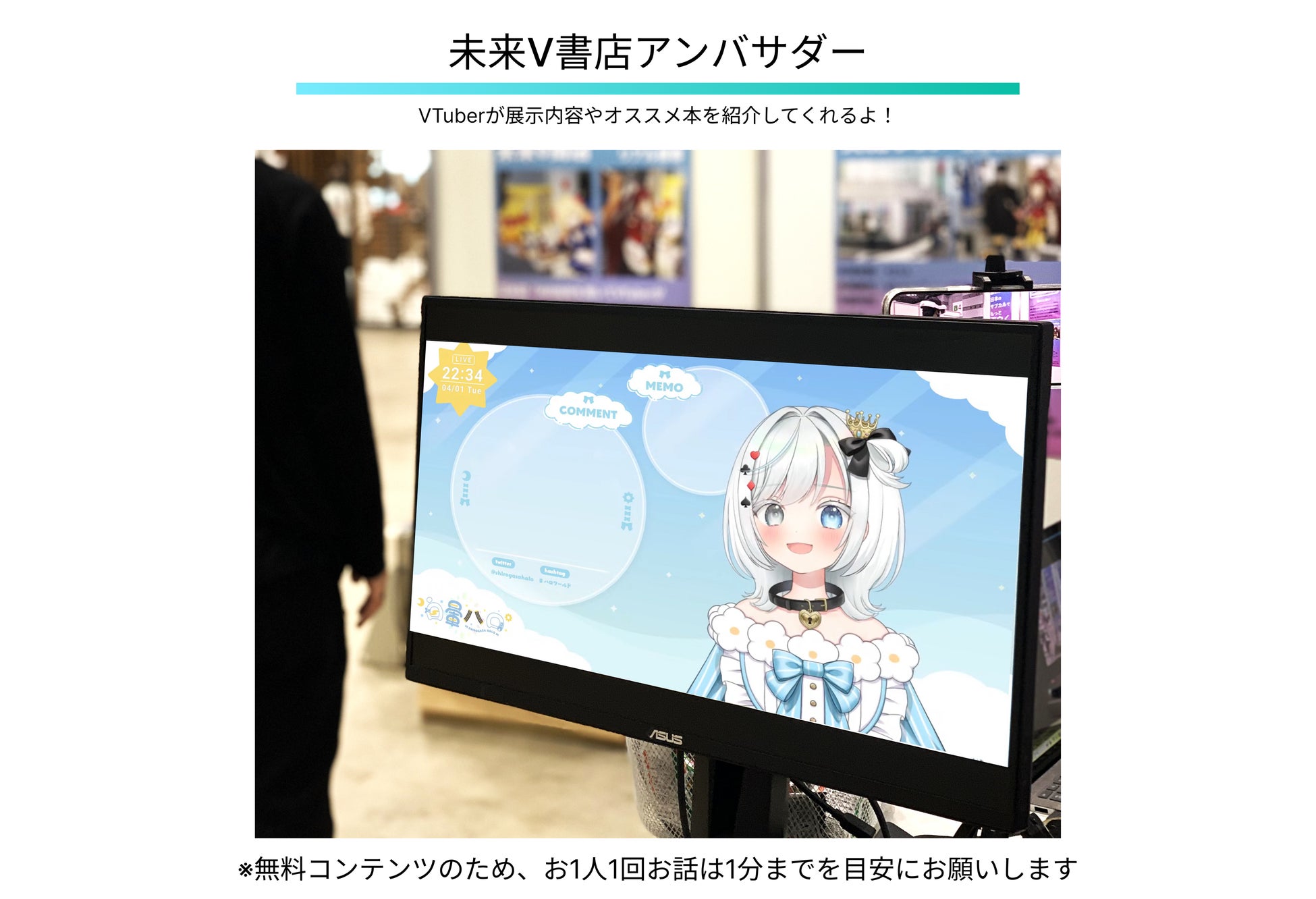 会場にモニターを設置し、VTuberがイベント会場の案内を行うだけでなく、自身オススメ本の紹介なども行います。実施日程や参加VTuberの詳細は公式SNSでの発信をお待ちください。