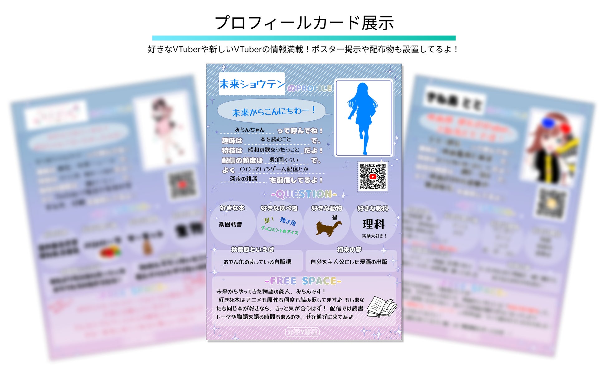 個性あふれるVTuberのプロフィールカードの展示をお楽しみください。