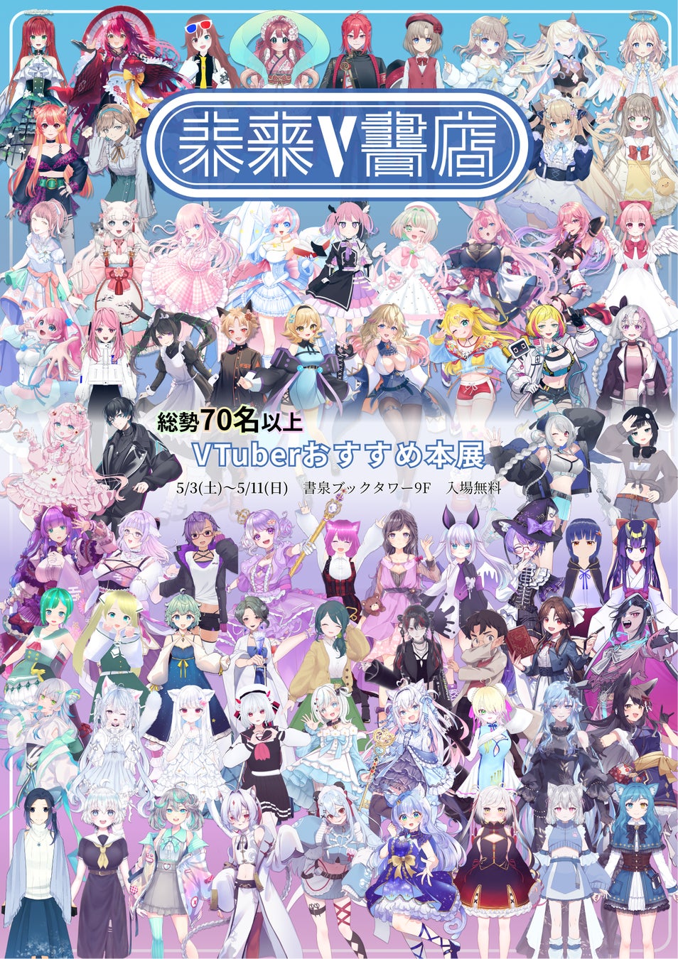 「未来V書店」とは、2025年5月3日(土)から5月11日(日)まで秋葉原にある書泉ブックタワーにて、70名以上のVTuberが自分のオススメ本をPOP形式で紹介する展示イベントになります。