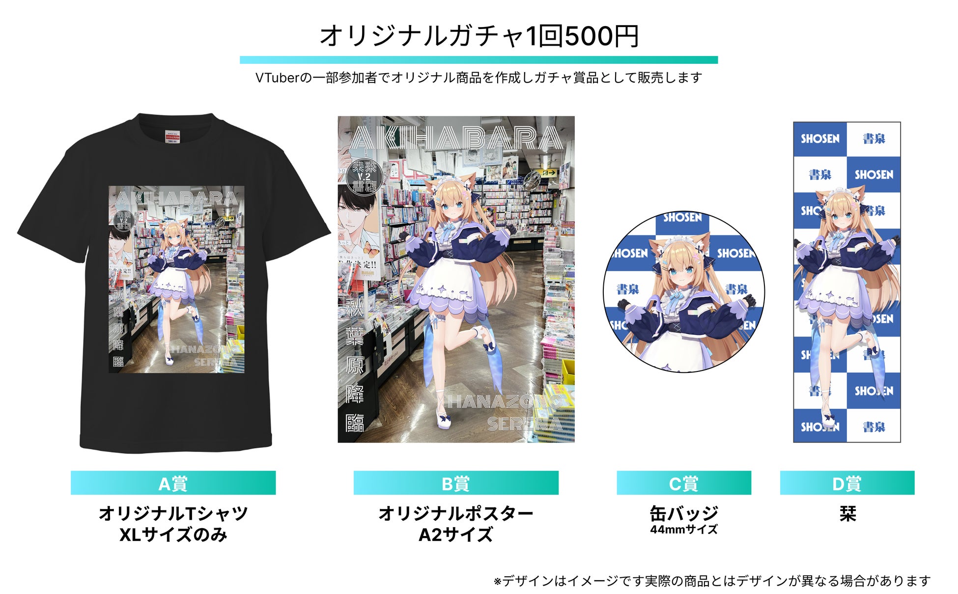 VTuberの一部参加者でオリジナル商品を作成し、ガチャ賞品として販売いたします。