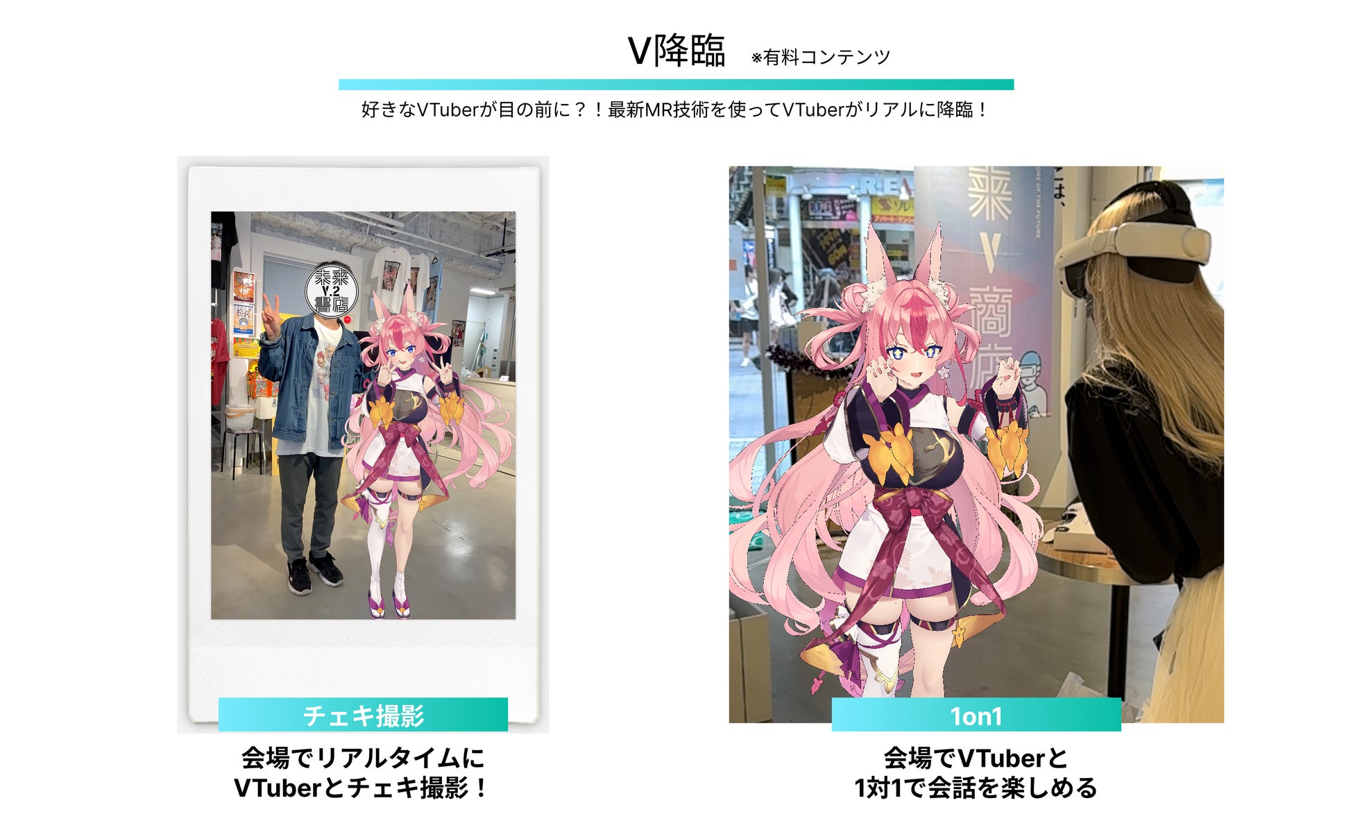 5月3日(土)~6日(火)はVTuberとのチェキ撮影や1on1の会話が楽しめる「V降臨」(有料コンテンツ)を実施いたします。実施日程や参加VTuberの詳細は公式SNSでの発信をお待ちください。