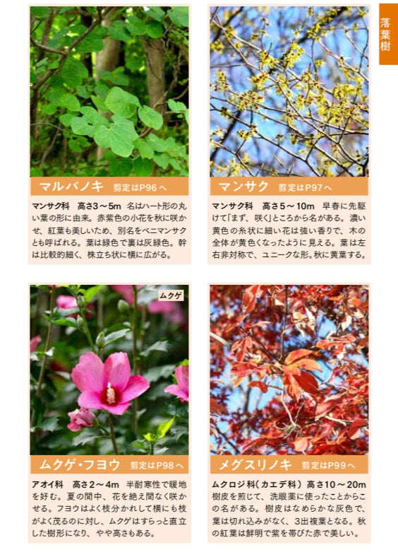 人気種から定番種まで、厳選されたおすすめの雑木100種の美しい写真を掲載。落葉樹、常緑樹などの種類別に見やすく解説しました。一緒に植えるとよく似合う、おすすめの下草図鑑も収録しています。