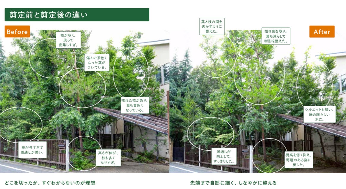 「バリカンで切りたて」といった、枝の途中からバッサリと切る方法では、緑が心地よい庭になりません。混み合った枝を適度に落とすことで、木漏れ日が入り、さわやかな風が吹き抜けるような木に剪定できます。