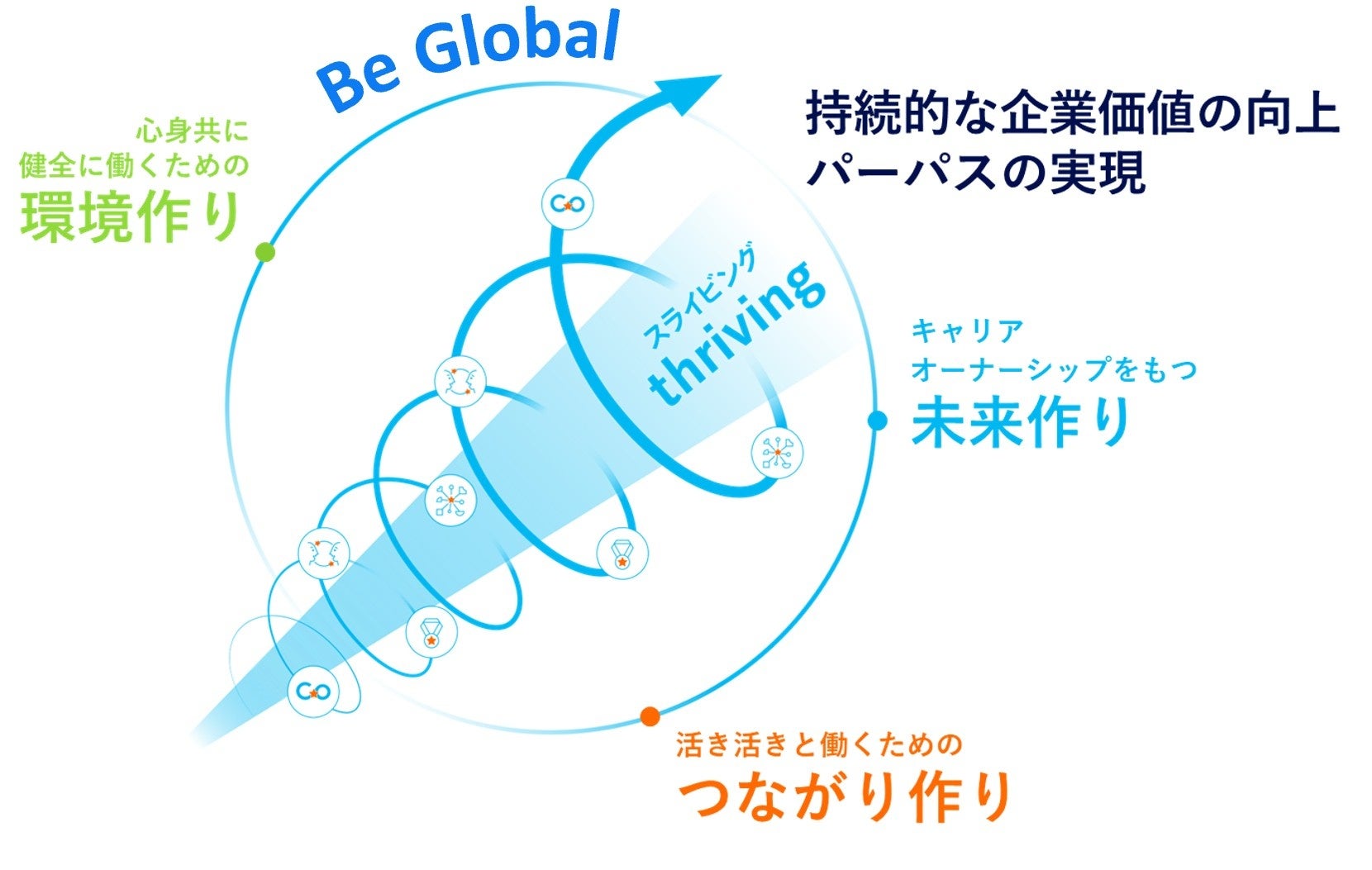 パナソニック コネクトでは、社員が「パーパスに向かって意義のある仕事をしている実感」「成長している実感」「活き活きと働いている実感」の3つの実感を得ているThriving(スライビング)な状態にあることをCONNECTers' Success(従業員サクセス)と定義し、これが企業価値を持続的に向上させ、パーパス実現につながると考えています。