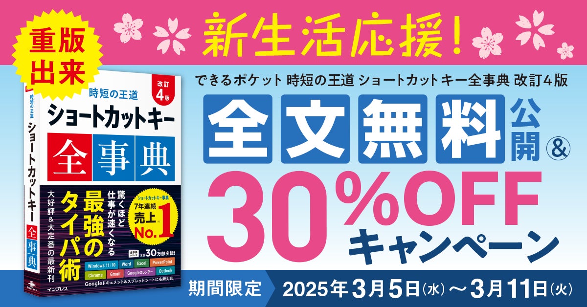 インプレスグループでIT関連メディア事業を展開する株式会社インプレス(本社:東京都千代田区、代表取締役社長:高橋隆志)は、書籍『できるポケット 時短の王道 ショートカットキー全事典 改訂4版』の重版出来を記念して、2025年3月5日(水)~3月11日(火)の7日間限定で本書の全文を無料公開するキャンペーンを実施します。また、直販サイト「インプレスブックス」にて本書の電子書籍版を30%オフで販売します。