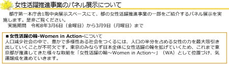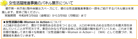 東京都は、男性も女性も共に活躍できる社会を目指し、「Women in Action」、「WA(わ)」を旗印に、女性活躍の輪を日本全体に拡げる取組を進めています。