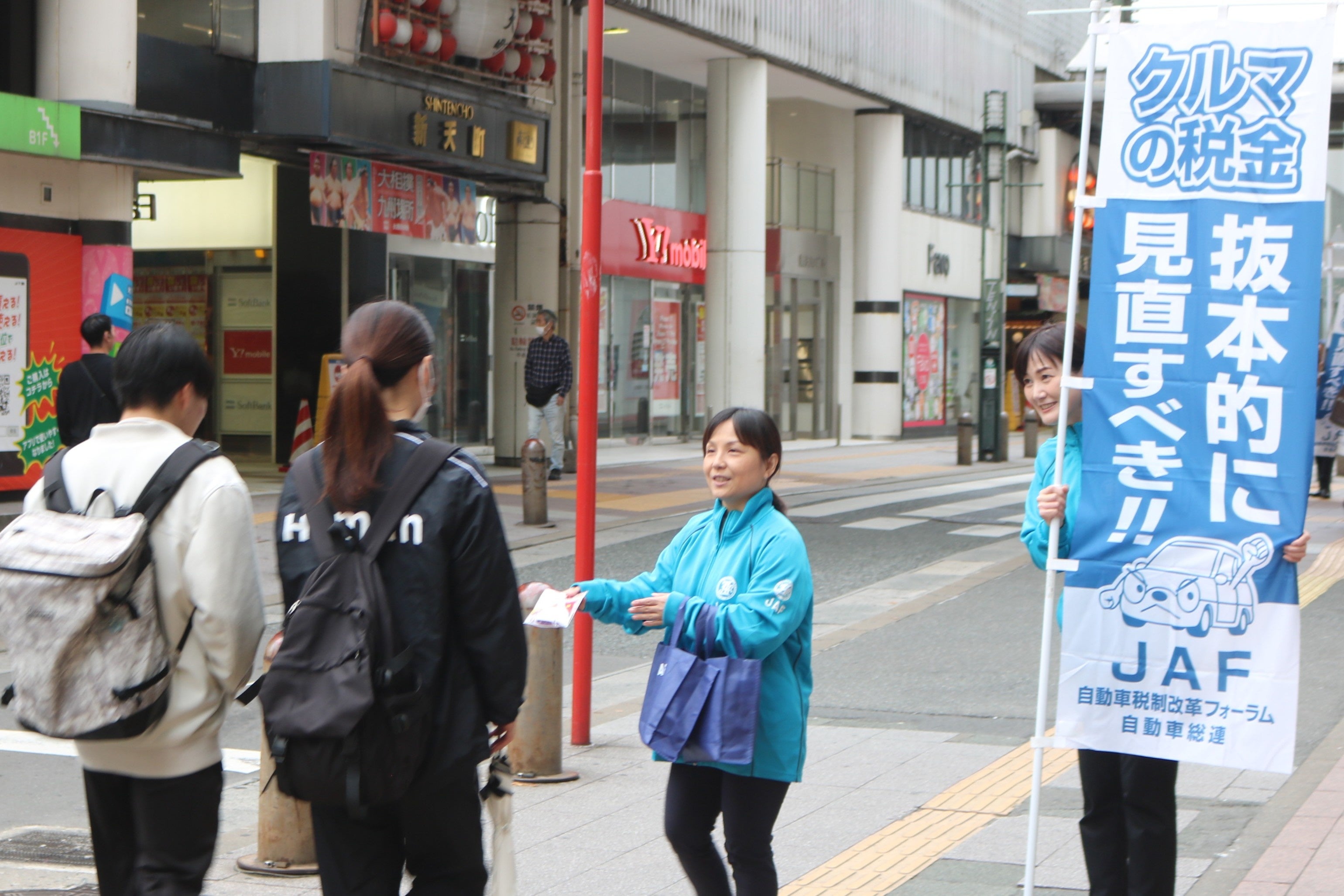 全国47都道府県の街頭で自動車税制の改革への理解を広げていく活動をおこなっています。本活動はJAFも参画している自動車税制改革フォーラム(自動車関連21団体で構成)を中心に取り組んでおり、自動車総連とも協力しておこなっています。