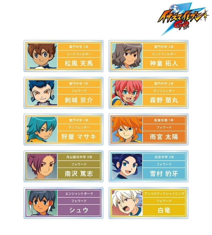 松風 天馬、神童 拓人、剣城 京介、霧野 蘭丸、狩屋 マサキ、雨宮 太陽、南沢 篤志、雪村 豹牙、シュウ、白竜のイラストと所属、ポジション、背番号をアクリルカードに仕上げました。