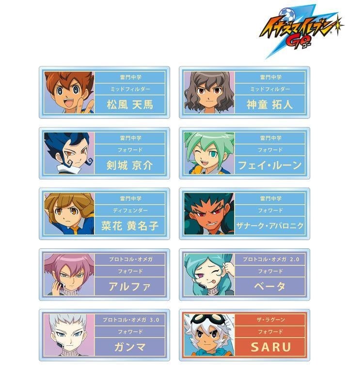 松風 天馬、神童 拓人、剣城 京介、フェイ・ルーン、菜花 黄名子、ザナーク・アバロニク、アルファ、ベータ、ガンマ、SARUのイラストと所属、ポジションをアクリルネームプレートに仕上げました。
