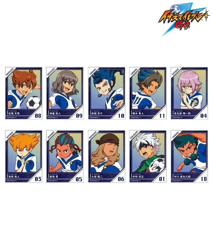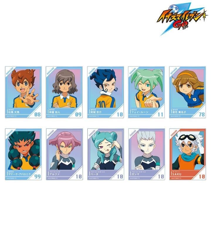 松風 天馬、神童 拓人、剣城 京介、瞬木 隼人、真名部 陣一郎、皆帆 和人、鉄角 真、九坂 隆二、井吹 宗正、市川 座名九郎のイラストと所属、ポジション、背番号をアクリルカードに仕上げました。