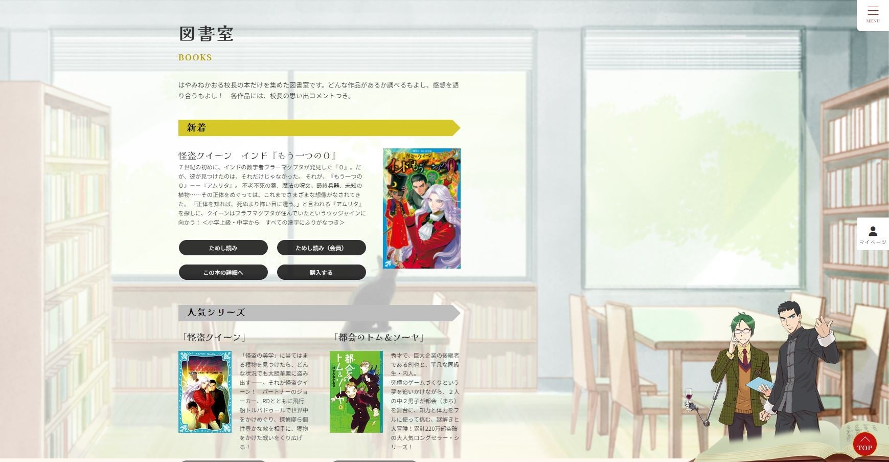 はやみね校長の全作品を紹介する「図書室」。 貴重な制作エピソードや思い出など先生のコメント付き。