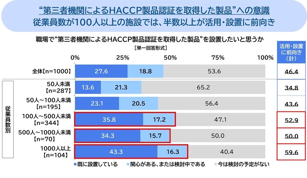 職場で“第三者機関によるHACCP製品認証を取得した製品”への意識について、食品関連施設の従業員数別にみると、100人~1,000人未満の施設では『活用・設置に前向き(計)』が5割以上(100人~500人未満52.9%、500人~1,000人未満50.0%)、1,000人以上の施設では6割(59.6%)となりました。従業員規模が大きい施設ほど、第三者機関による認証を受けた信頼性の高い設備・機器の導入意欲が高く、衛生管理手法“HACCP”の対応に適した設備の選定に積極的な傾向が見られます。