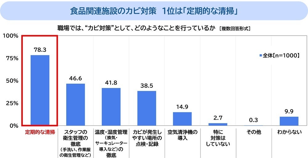 全回答者(1,000名)に、職場では、“カビ対策”として、どのようなことを行っているか聞いたところ、「定期的な清掃」(78.3%)が突出して高くなり、衛生管理の基本として重視されていることがわかりました。以降、「スタッフの衛生管理の徹底(手洗い、作業服の衛生管理など)」(46.6%)、「温度・湿度管理(換気・サーキュレーター導入など)の徹底」(41.8%)の順となりました。