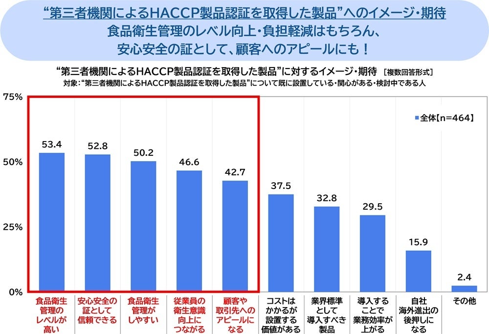 職場で“第三者機関によるHACCP製品認証を取得した製品”について、既に設置している・関心がある・検討中である人(464名)に、“第三者機関によるHACCP製品認証を取得した製品”に対するイメージ・期待を聞いたところ、「食品衛生管理のレベルが高い」(53.4%)が最も高くなり、「安心安全の証として信頼できる」(52.8%)、「食品衛生管理がしやすい」(50.2%)、「従業員の衛生意識向上につながる」(46.6%)、「顧客や取引先へのアピールになる」(42.7%)が続きました。