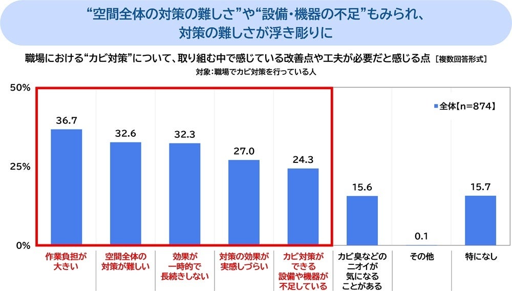職場における“カビ対策”について、取り組む中で感じている改善点や工夫が必要だと感じる点を聞いたところ、「作業負担が大きい」(36.7%)が最も高く、次いで「空間全体の対策が難しい」(32.6%)、「効果が一時的で長続きしない」(32.3%)、「対策の効果が実感しづらい」(27.0%)、「カビ対策ができる設備や機器が不足している」(24.3%)となりました。“作業負担の大きさ”のほか、“空間全体の対策の難しさ”、“設備や機器の不足”についても少なくない結果となり、対策の難しさが浮き彫りになりました。