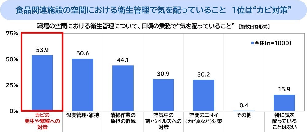 職場の空間における衛生管理について、日頃の業務で“気を配っていること”を聞いたところ、「カビの発生や繁殖への対策」(53.9%)が最も高くなりました。食品関連施設においてカビへの対策を行うことの必要性や重要性を感じている人が多いことがわかりました。