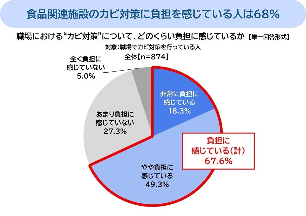 職場でカビ対策を行っている人(874名)に、職場における“カビ対策”について、どのくらい負担に感じているか聞いたところ、「非常に負担に感じている」が18.3%、「やや負担に感じている」が49.3%、合計した『負担に感じている(計)』が67.6%で、半数以上の結果となりました。負担感の削減に向けて対策を講じる必要がありそうです。