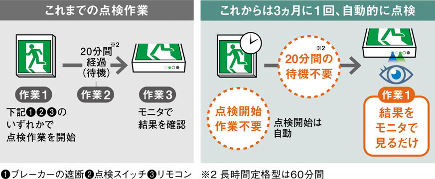 従来のバッテリー点検では、ボタンやリモコン操作により点検を開始し、バッテリーによって20分間(※2)点灯できるかを確認するため、点検完了まで待機時間が発生していました。「みるだけバッテリーチェック」機能付き誘導灯は、定期的に自動で点検を行うため、待機時間がなく、短時間で点検を完了できます。