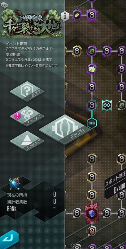 本イベントは、クエストクリアで獲得したイベントアイテム「集霊宝珠」の使用や、専用ミッションのクリア、強力なボスを撃破することで、各地を奪還し報酬を獲得します。様々な報酬が散りばめられたイベントマップは圧巻! どのルートに進むか考えながらプレイできるイベントです。